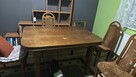 Sprzedam stół z 4 krzesłami i 2 fotelami Dębowy Krzesła drewniane rzeżbione, obite skórą Wymiary stołu dł. 180 ...
